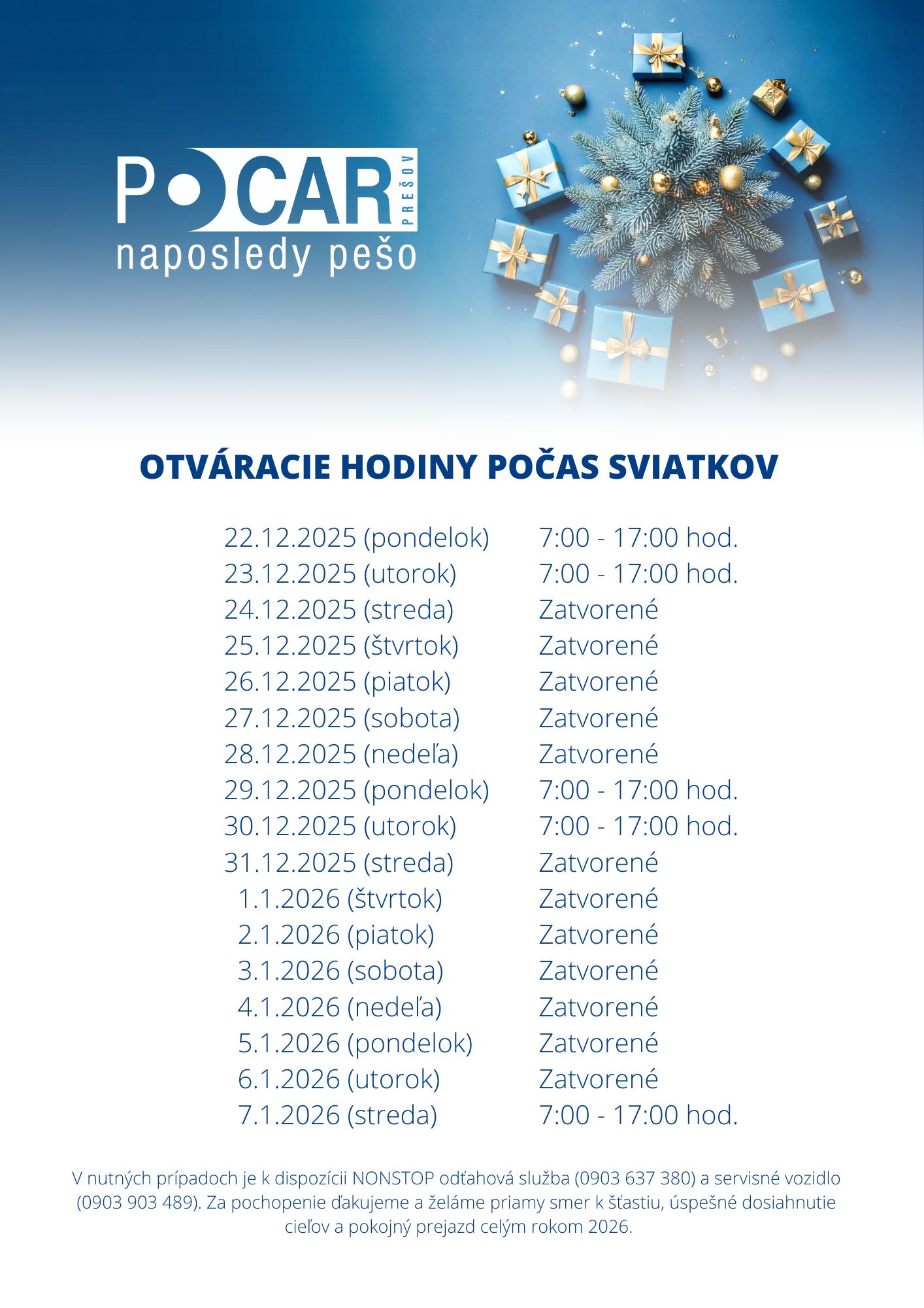 Milí zákazníci, v blížiacom sa sviatočnom období a úvode nového roka 2025 budú otváracie hodiny autosalónov, servisu a predaja náhradných dielov upravené takto: